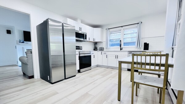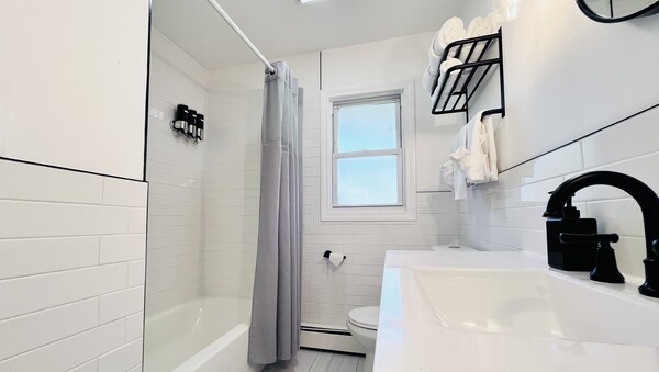 Welcome to our Family Suite! Perfect for up to seven (7) guests, this spacious retreat features a queen bed, two full beds, and a sofa bed.
